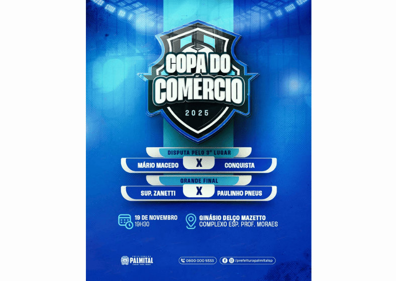A 10ª Copa do Comércio de Futsal de Palmital, que leva o nome de Gerson Antônio (Gel) Zanetti, terá sua final nesta quarta-feira, 19 de novembro, no Ginásio Delço Mazetto. A programação inclui a disputa pelo terceiro lugar entre Mário Macedo e Conquista, seguida da decisão do título entre Supermercado Zanetti e Paulinho Pneus.