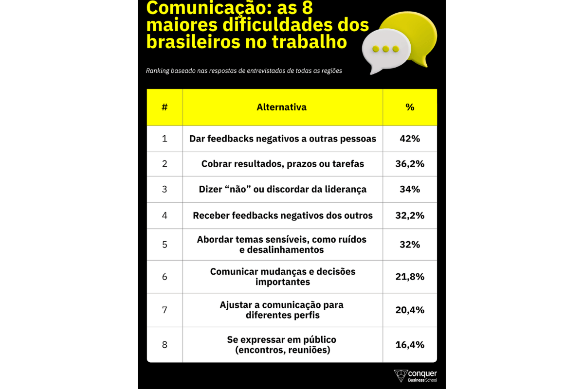 Quase metade dos brasileiros reconhece dificuldade ao dar feedbacks negativos no ambiente de trabalho. Segundo estudo divulgado pela Conquer Business School, 42% dos entrevistados afirmam que o maior desafio de comunicação é criticar, avaliar ou apontar melhorias no trabalho de colegas.