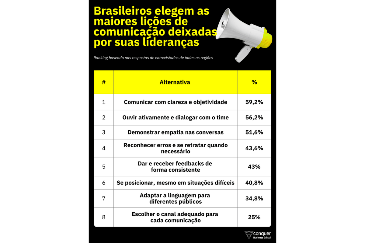 O estudo também mostra a influência da liderança no desenvolvimento dessa habilidade. Entre os aprendizados mais citados com ex-líderes estão a clareza e objetividade na comunicação, mencionadas por 59,2%, a escuta ativa, destacada por 56,2%, e a empatia nas trocas, lembrada por 51,6%.