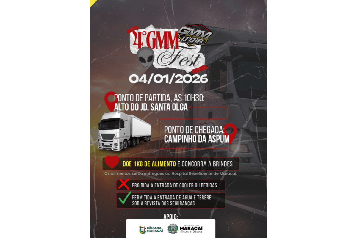 O tradicional encontro de caminhoneiros de Maracaí volta a movimentar o início do ano: o 4º GMM Fest será realizado no dia 4 de janeiro de 2026, reunindo motoristas, famílias e apaixonados pela cultura das estradas em um evento gratuito, solidário e aberto ao público. A concentração acontece às 10h30, no Alto do Jardim Santa Olga, com chegada no Campinho da ASPUM.