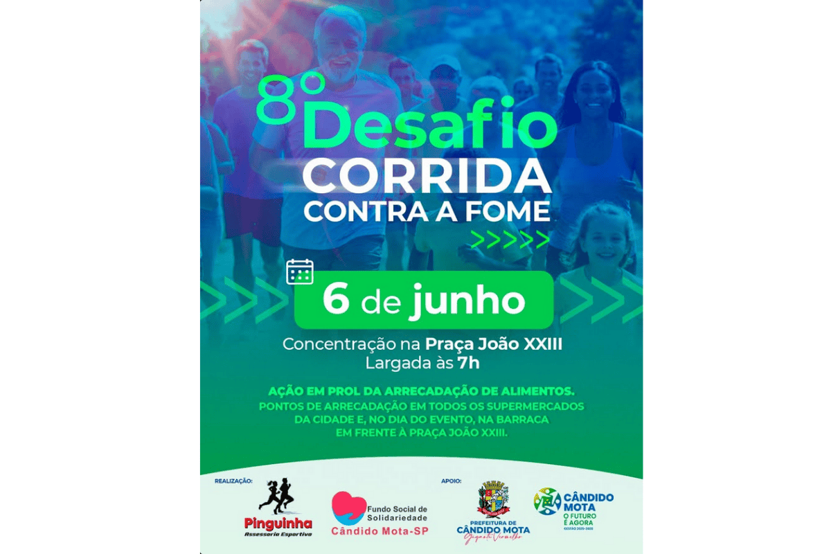 O Desafio Corrida Contra a Fome é realizado pelo Fundo Social de Solidariedade de Cândido Mota em parceria com a Pinguinha Assessoria Esportiva. O evento conta com apoio da Prefeitura Municipal de Cândido Mota e integra o calendário de ações voltadas à promoção da solidariedade por meio do esporte.
