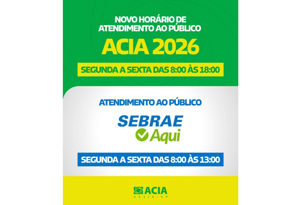 A Associação Comercial e Industrial de Assis (ACIA) divulgou o novo horário de atendimento ao público para 2026, que passa a vigorar de segunda a sexta-feira, das 8h às 18h. A mudança busca ampliar o acesso de empresários, comerciantes e associados aos serviços oferecidos pela entidade ao longo do dia.