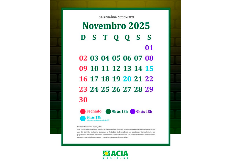 A ACIA – Associação Comercial e Industrial de Assis divulgou o calendário sugestivo de funcionamento do comércio para o mês de novembro de 2025. De acordo com a programação, as lojas da cidade funcionam de segunda a sexta-feira, das 9h às 18h, e aos sábados, das 9h às 15h. Aos domingos, o comércio permanece fechado.