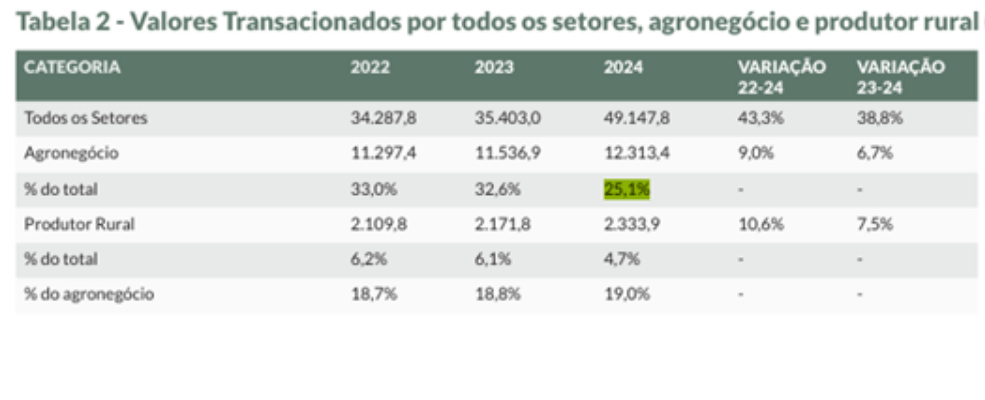 O levantamento também detalha o desempenho do produtor rural dentro do agronegócio. Entre 2022 e 2024, os valores transacionados por produtores cresceram 10,6%, com leve aumento de participação relativa no setor, de 18,7% para 19,0%. O resultado aponta maior protagonismo desses agentes, indicando mais produção própria e maior volume de operações formalmente registradas.