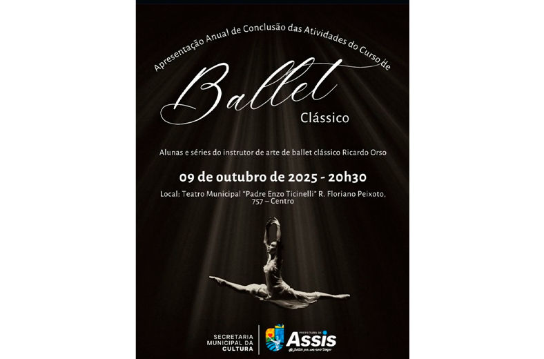 A Prefeitura de Assis, por meio da Secretaria Municipal de Cultura, realiza nesta quinta-feira, 9 de outubro, a Apresentação Anual de Conclusão das Atividades do Curso de Ballet Clássico da Semeart 2025. O evento será às 20h30, no Teatro Municipal Padre Enzo Ticinelli, com entrada gratuita.