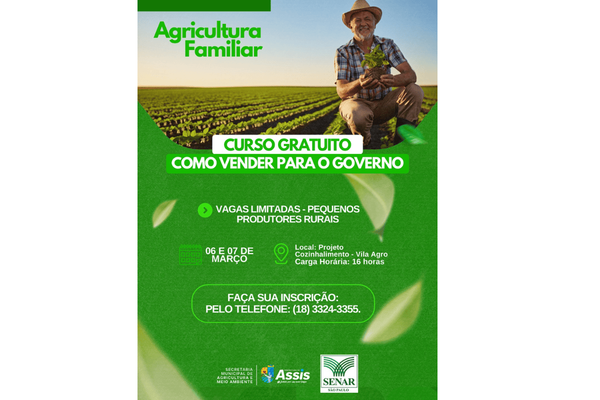 A Prefeitura de Assis, por meio da Secretaria de Agricultura e Meio Ambiente, em parceria com o Serviço Nacional de Aprendizagem Rural, Senar/SP, realizará nos dias 6 e 7 de março de 2026 o curso gratuito “Como Vender para o Governo”, voltado a produtores rurais do município. A capacitação terá carga horária de 16 horas e será realizada no Projeto CozinhAlimento, na Vila Agro.