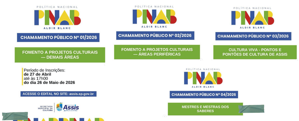 A Prefeitura de Assis, por meio da Secretaria Municipal de Cultura, abre nesta segunda-feira, 27 de abril, as inscrições para quatro editais da Política Nacional Aldir Blanc (PNAB). A iniciativa amplia o acesso a recursos para artistas, coletivos e agentes culturais, com foco no fortalecimento da produção local em diferentes frentes.