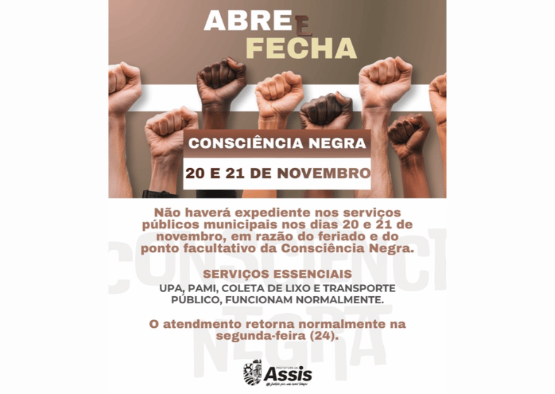 A Prefeitura de Assis informou como será o funcionamento dos serviços públicos municipais durante o feriado do Dia da Consciência Negra, nesta quinta-feira, 20 de novembro, e no ponto facultativo da sexta-feira, 21. Não haverá expediente nas repartições municipais nesses dois dias, com exceção dos atendimentos considerados essenciais.