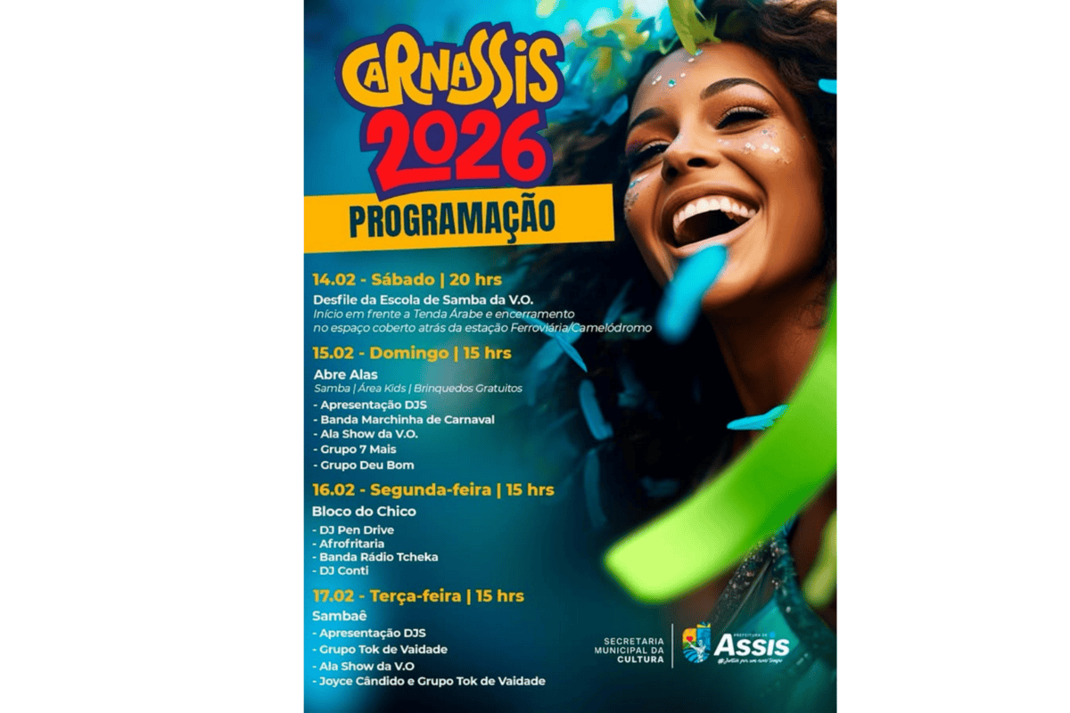 Realizado pela Secretaria Municipal da Cultura e pela Prefeitura de Assis, o Carnassis 2026 reforça o Carnaval como uma das principais manifestações culturais da cidade, promovendo acesso gratuito à cultura, valorização dos artistas locais e opções de lazer para moradores e visitantes durante o período carnavalesco.