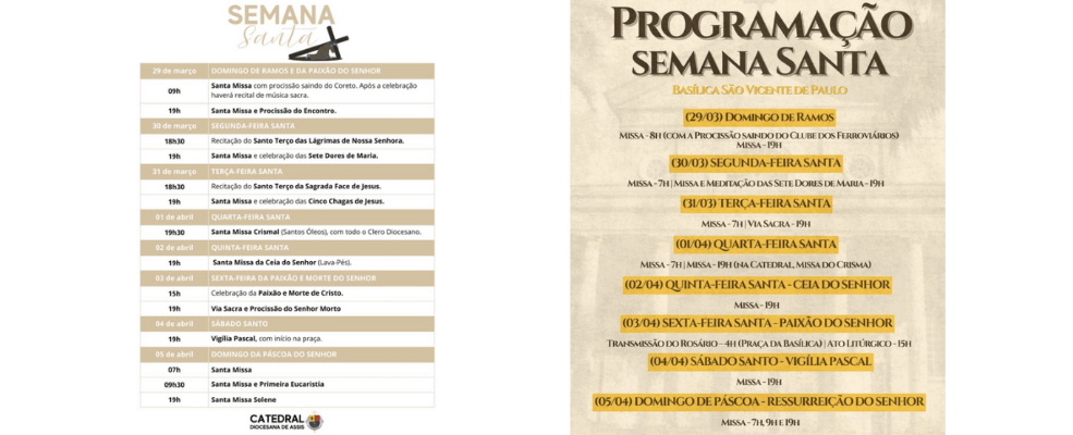 Com a proximidade da Semana Santa, o Âncora1 divulgou a programação completa da Basílica São Vicente de Paulo e da Catedral Diocesana, com celebrações entre os dias 29 de março e 5 de abril. Outras paróquias devem divulgar suas agendas diretamente aos fiéis.