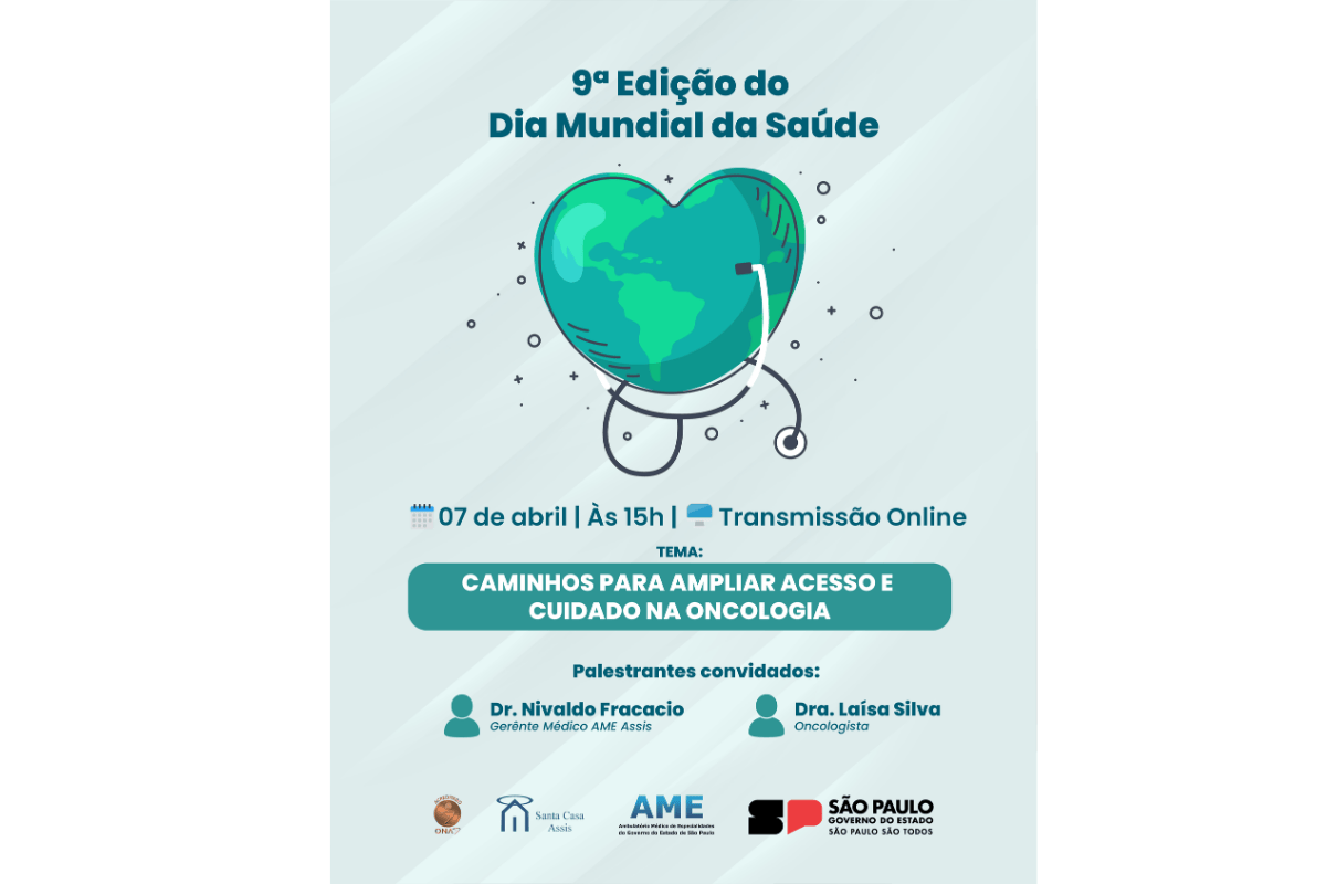 Já no período da tarde, às 15h, o AME Assis realiza a 9ª edição do tradicional evento do Dia Mundial da Saúde, neste ano em formato online, com o tema “Caminhos para Ampliar o Acesso e Cuidado na Oncologia”. A proposta é discutir estratégias, desafios e avanços no atendimento oncológico, com foco no diagnóstico precoce, acesso ao tratamento e cuidado humanizado.