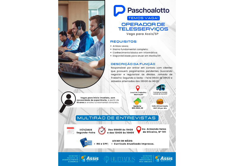A Prefeitura de Assis, por meio da Secretaria de Desenvolvimento Econômico / PAT e da Secretaria de Agricultura e Meio Ambiente, em parceria com a empresa Paschoalotto, promove na próxima segunda-feira, 17 de novembro, um mutirão do emprego para o preenchimento de 45 vagas de operador de telesserviços.