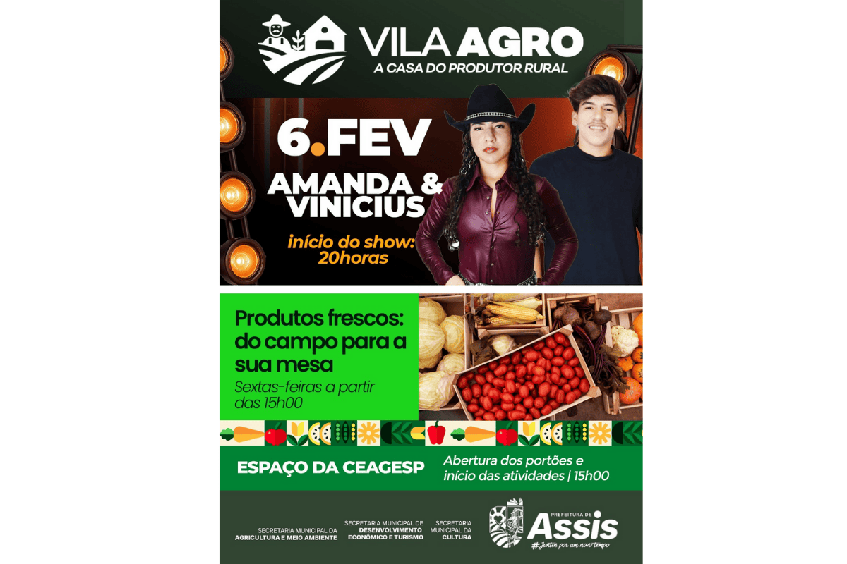 A Prefeitura de Assis realiza nesta sexta-feira, 6 de fevereiro de 2026, mais uma edição da Vila Agro, iniciativa que une produtores rurais, gastronomia artesanal e atividades culturais em um espaço de convivência aberto à população, com abertura dos portões às 15h e show ao vivo a partir das 20h.