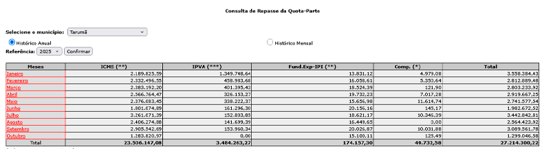 De janeiro a outubro, o município de Tarumã já soma R$ 27.214.300,22 em repasses estaduais de ICMS, evidenciando estabilidade nas transferências e o fortalecimento de sua economia local.