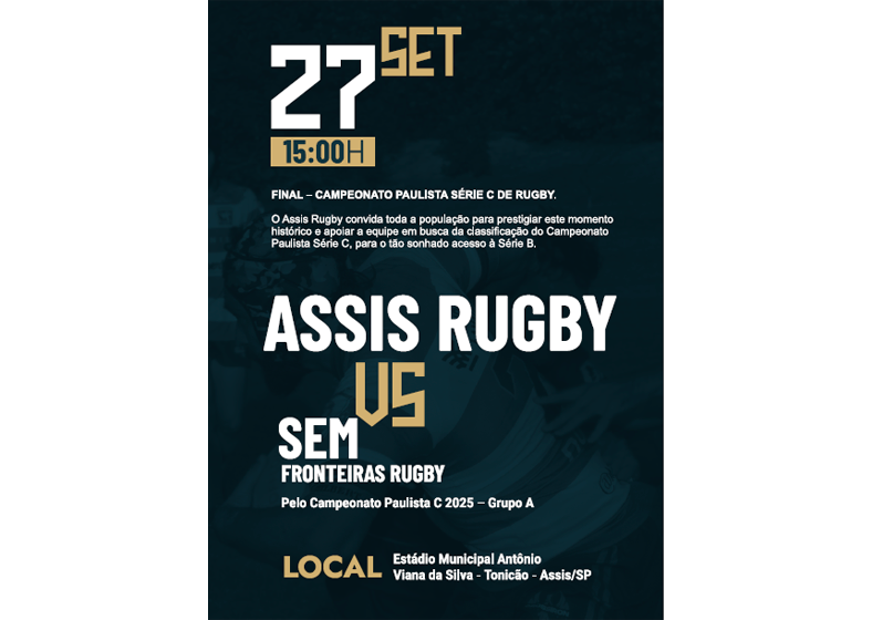 O Assis Rugby vive um momento inédito em sua trajetória esportiva. Após campanha consistente e a vitória decisiva sobre o Barueri Rugby por 50 a 7, no Estádio Marcelino, o time da cidade garantiu vaga na final do Campeonato Paulista de Rugby – Série C. A grande decisão acontece neste sábado, 27 de setembro, às 15h, no Estádio Municipal Antônio Viana da Silva, o Tonicão, contra o Sem Fronteiras Rugby.