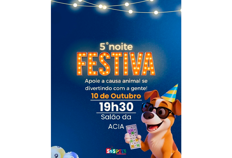 A ONG SOS Pets Assis realiza nesta sexta-feira, 10 de outubro, a 5ª Noite Festiva em prol da causa animal, um evento solidário que une diversão e solidariedade. A atividade acontece a partir das 19h30, no salão da Associação Comercial e Industrial de Assis (ACIA), com o objetivo de arrecadar fundos para custear atendimentos veterinários, castrações e cuidados com animais resgatados.