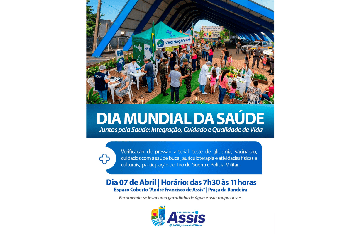 Com a chegada de abril, Assis se prepara para marcar o Dia Mundial da Saúde com uma ação voltada ao bem-estar da população. O evento será realizado na próxima terça-feira, 7 de abril, a partir das 7h30, no Espaço Coberto André Francisco de Assis, na Praça da Bandeira.