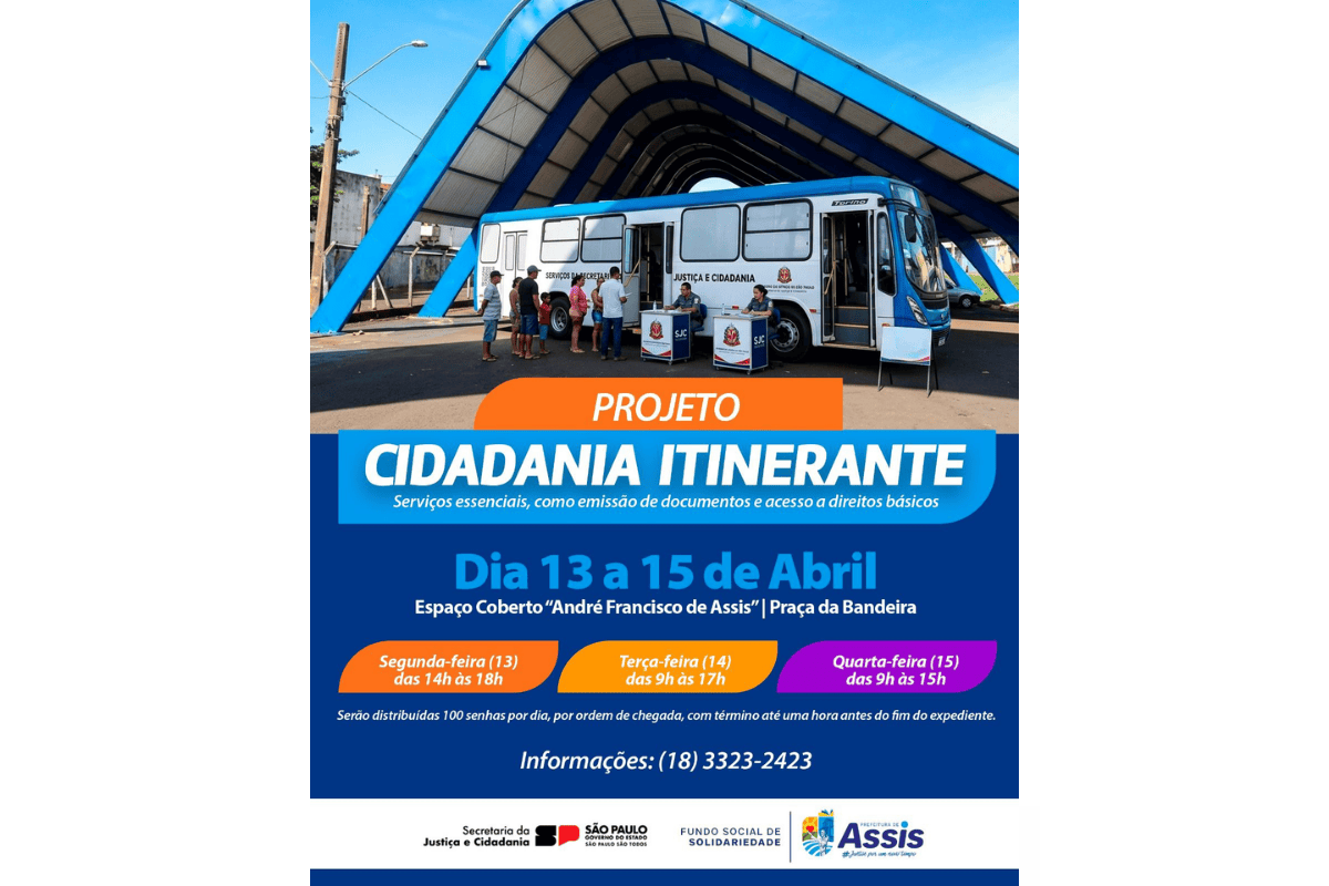 Assis recebe, entre os dias 13 e 15 de abril, o projeto Cidadania Itinerante, com oferta de serviços gratuitos à população em parceria com o Governo do Estado de São Paulo. A ação será realizada no Espaço Coberto “André Francisco de Assis”, em frente à Praça da Bandeira, com atendimentos por ordem de chegada e distribuição de 100 senhas por dia.