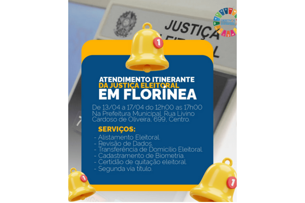 Segue até sexta-feira, 17 de abril, o atendimento itinerante da Justiça Eleitoral em Florínea, com serviços voltados à regularização da situação eleitoral dos moradores. A ação, que começou no dia 13, acontece na Prefeitura Municipal, localizada na Rua Livino Cardoso de Oliveira, 699, no Centro, sempre das 12h às 17h.