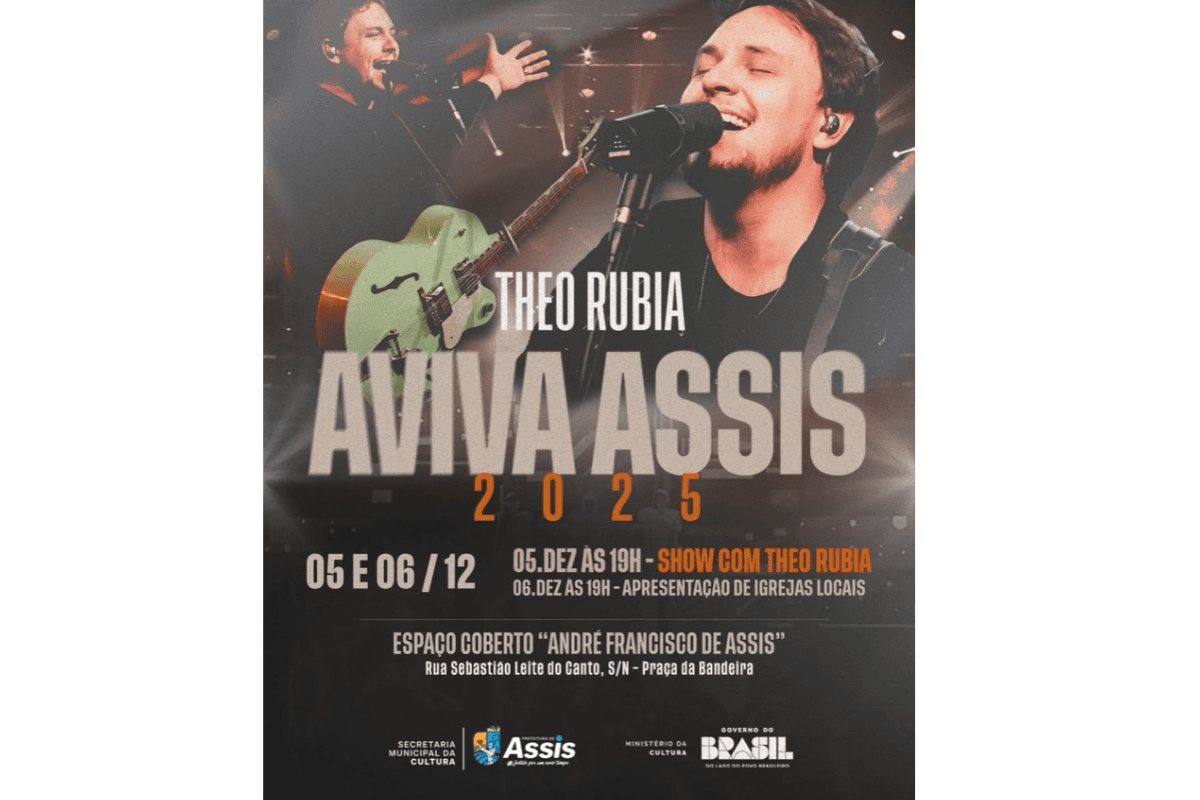 Assis realizará duas noites de música e celebração nos dias 5 e 6 de dezembro, no Espaço Coberto André Francisco de Assis, na Praça da Bandeira, com entrada gratuita. A abertura do Aviva Assis 2025 será na sexta-feira, 5 de dezembro, às 19h, com show do cantor Theo Rubia. No sábado, 6 de dezembro, às 19h, a programação segue com apresentações de igrejas da cidade.