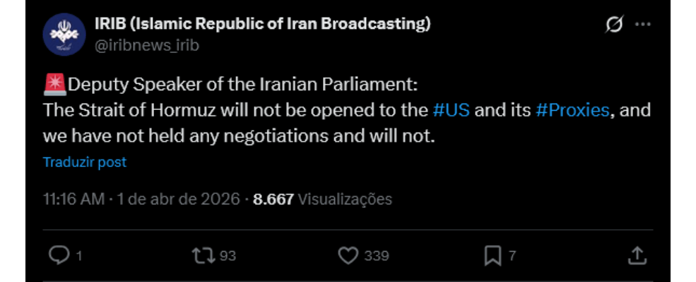 Pouco depois, o vice-presidente do Parlamento iraniano se manifestou publicamente, negando qualquer negociação. Segundo a autoridade, não houve diálogo com os Estados Unidos e não há intenção de abrir o Estreito de Ormuz nas condições mencionadas.