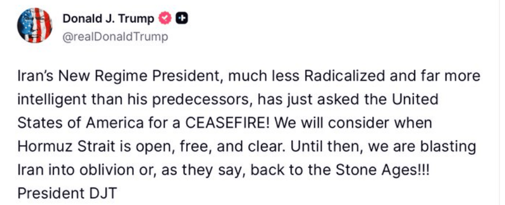 Em publicação, Trump afirmou que o “novo regime do Irã” teria solicitado um cessar-fogo aos Estados Unidos e condicionou qualquer análise à reabertura do Estreito de Ormuz. A mensagem também incluiu tom ameaçador ao mencionar possíveis ações militares caso a condição não seja atendida.