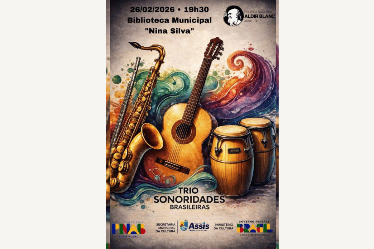 A Biblioteca Municipal “Nina Silva”, em Assis, recebe nesta quinta-feira, 26 de fevereiro de 2026, às 19h30, a apresentação do Trio Sonoridades Brasileiras. O evento é gratuito e aberto ao público.
