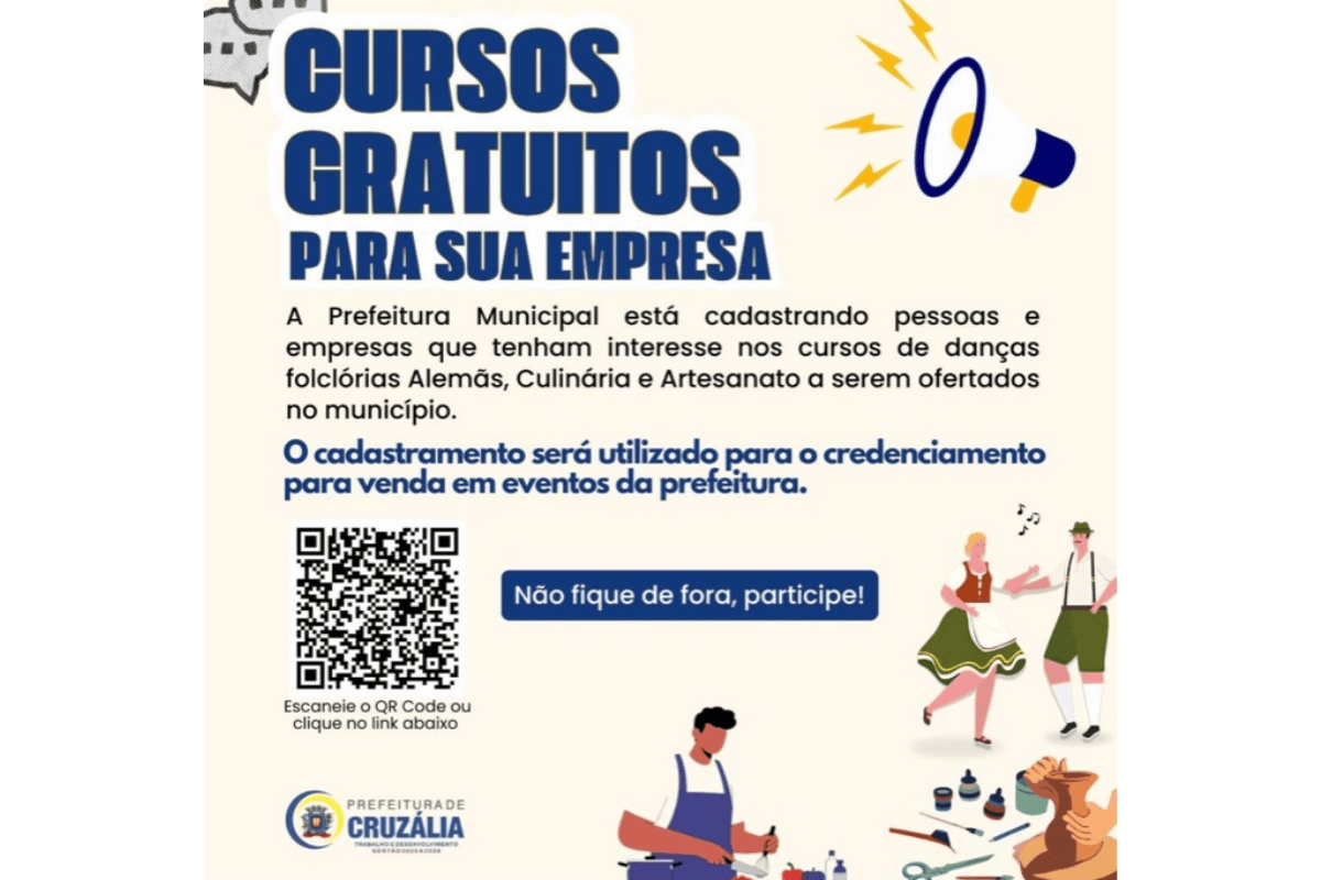 A Prefeitura de Cruzália abriu o cadastramento de pessoas físicas e empresas interessadas em participar de cursos gratuitos voltados à qualificação e valorização cultural e turística do município. A iniciativa contempla áreas como dança folclórica alemã, culinária e artesanato, e tem como objetivo fortalecer a identidade cultural local e ampliar oportunidades para a economia criativa.