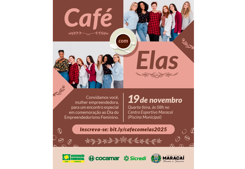 Em comemoração ao Dia do Empreendedorismo Feminino, a Prefeitura de Maracaí, em parceria com a Associação Comercial e Industrial (ACIM), Cocamar e Sicredi, realiza na quarta-feira, 19 de novembro, o evento Café com Elas, um encontro voltado à valorização e fortalecimento das mulheres empreendedoras do município.