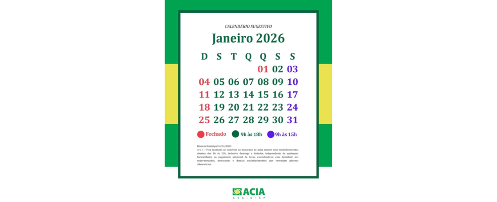 A Associação Comercial e Industrial de Assis (ACIA) divulgou o calendário sugestivo de funcionamento do comércio para janeiro de 2026. O objetivo é orientar consumidores e lojistas sobre os horários praticados ao longo do mês, permitindo melhor planejamento de compras, descanso dos trabalhadores e organização das atividades econômicas no início do ano.