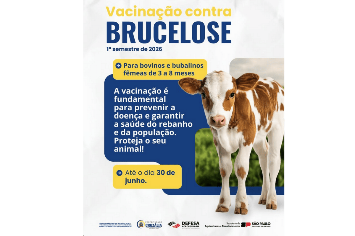 A Prefeitura de Cruzália, por meio do Departamento Municipal de Agricultura, Abastecimento e Meio Ambiente, reforça a importância da vacinação contra a brucelose no rebanho. A campanha segue em andamento neste primeiro semestre de 2026 e tem prazo até o dia 30 de junho.