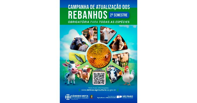 A Prefeitura de Cândido Mota reforça o alerta da Secretaria de Agricultura e Abastecimento do Estado de São Paulo sobre a Campanha de Atualização de Rebanhos do 2º semestre, que teve início em 1º de novembro e segue até o dia 15 de dezembro.