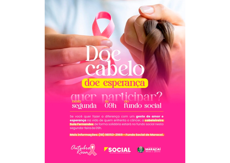 Nesta segunda-feira, às 9h, o Fundo Social de Solidariedade de Maracaí realiza mais uma edição da campanha “Doe cabelo, doe esperança”, iniciativa que integra as ações do Outubro Rosa, mês dedicado à prevenção e conscientização sobre o câncer de mama.