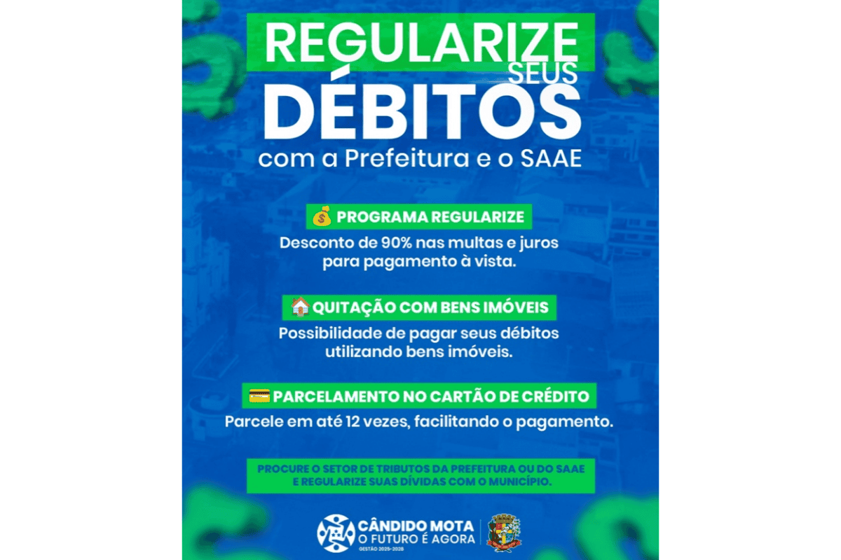 A Prefeitura de Cândido Mota e o SAAE anunciaram novas oportunidades para que contribuintes regularizem dívidas municipais ainda em 2025. O objetivo é facilitar o pagamento, evitar a negativação de moradores e fortalecer o investimento em serviços públicos essenciais. As medidas já estão em vigor e podem ser acessadas diretamente no setor de Tributos.