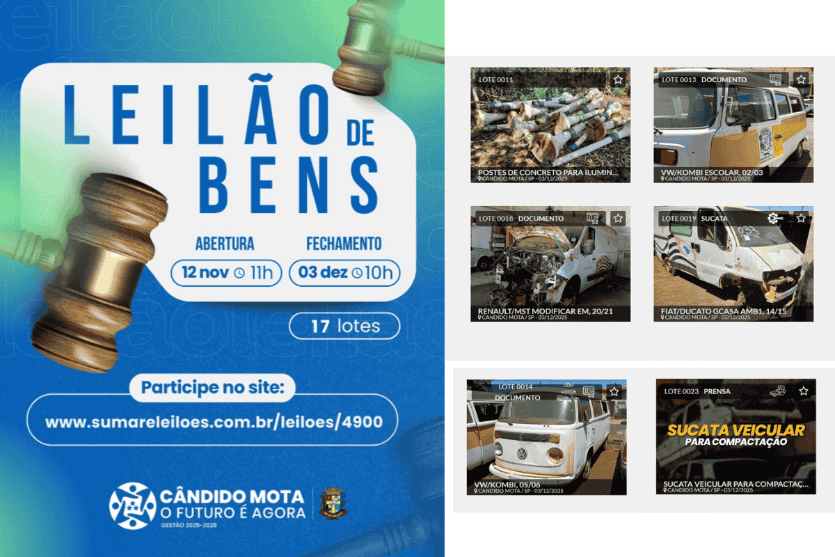 O leilão de bens da Prefeitura de Cândido Mota continua aberto ao público e encerra na próxima sexta-feira, dia 12 de dezembro. O processo está disponível no portal Sumaré Leilões, com 17 lotes que incluem veículos, máquinas, equipamentos e materiais considerados inservíveis pela Administração Municipal. A abertura ocorreu em 12 de novembro e o encerramento está previsto para às 10h do dia 12.