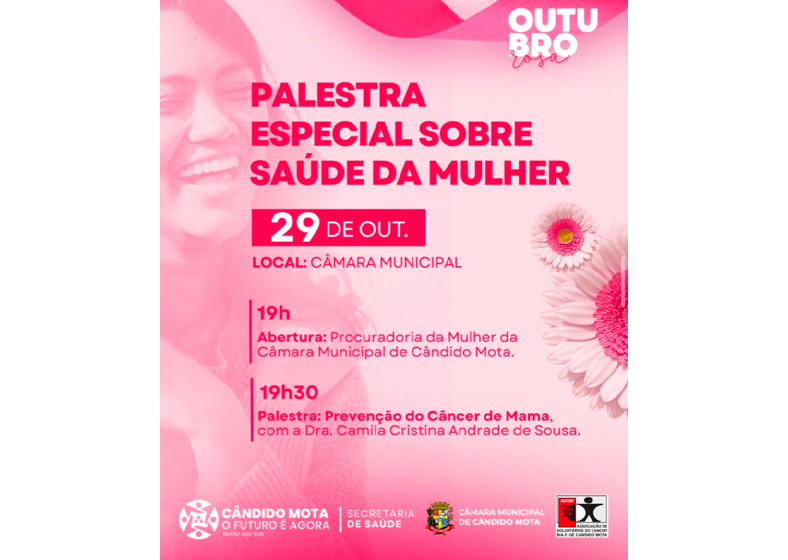 Como parte das ações do Outubro Rosa, a Secretaria de Saúde de Cândido Mota, em parceria com a Câmara Municipal e a Associação de Voluntários do Câncer “Bia Franciscatti”, realiza nesta quarta-feira, dia 29 de outubro, às 19h, uma palestra especial sobre a saúde da mulher. O encontro será na Câmara Municipal de Cândido Mota e é aberto ao público.