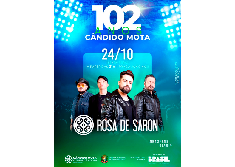 As comemorações pelos 102 anos de Cândido Mota continuam nesta sexta-feira, 24 de outubro, com um show especial da banda Rosa de Saron, um dos maiores nomes do rock cristão no Brasil. A apresentação acontece na Praça João XXIII, a partir das 21h, com entrada gratuita.