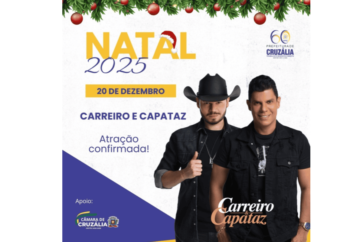 A Prefeitura de Cruzália confirmou que a dupla Carreiro & Capataz será a atração principal da programação de Natal 2025 no município. O show acontece no dia 20 de dezembro, na Praça Herbert Henschel, e integra a agenda festiva já divulgada anteriormente pela administração municipal.