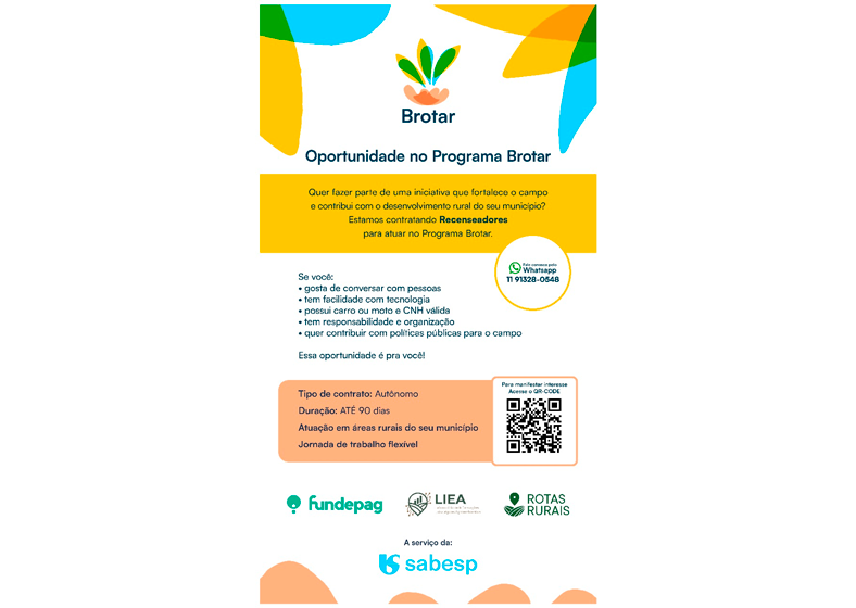 Os interessados em participar do processo seletivo podem escanear o QR Code disponível no material de divulgação do Programa Brotar e preencher o formulário digital de adesão. Dúvidas e informações adicionais podem ser obtidas pelo WhatsApp: (11) 91328-0548.