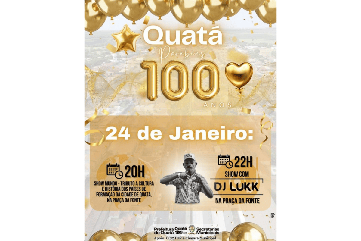 O município de Quatá segue celebrando seu centenário com uma programação especial neste sábado, 24 de janeiro, reunindo cultura, história e música em um evento aberto à população. As atividades acontecem na Praça da Fonte e integram o calendário oficial dos 100 anos da cidade.