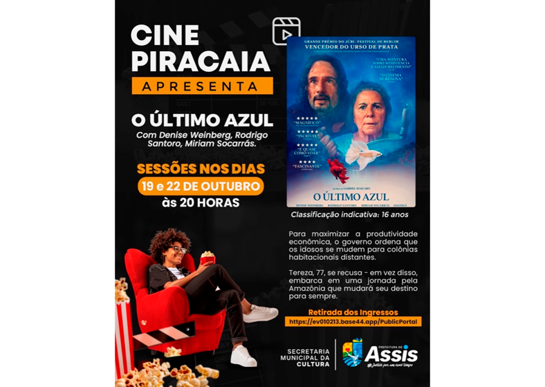 A Prefeitura de Assis, por meio da Secretaria Municipal da Cultura, realiza nesta quarta-feira, 22 de outubro, mais uma sessão especial do Cine Piracaia, que exibe o filme “O Último Azul”, estrelado por Denise Weinberg, Rodrigo Santoro e Miriam Socarrás.
