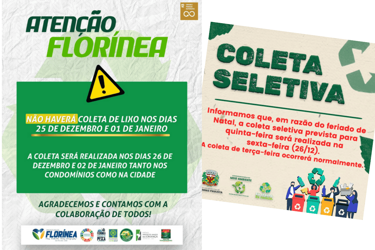Já em Florínea, a mudança envolve a coleta de lixo comum. Conforme comunicado da prefeitura, não haverá coleta nos dias 25 de dezembro e 1º de janeiro. O serviço será realizado excepcionalmente nos dias 26 de dezembro e 2 de janeiro, atendendo tanto os condomínios quanto os demais bairros da cidade.