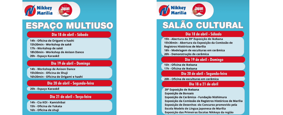 O 23º Japan Fest acontece no Nikkey Clube de Marília e é aberto ao público de toda a região. A entrada é solidária, com a doação de 1 kg de alimento não perecível ou pagamento de R$ 5, com arrecadação destinada ao Fundo Social.