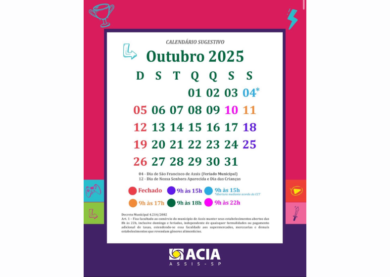A Associação Comercial e Industrial de Assis (ACIA) divulgou o calendário sugestivo de funcionamento do comércio para o mês de outubro de 2025. De segunda a sexta-feira, as lojas funcionam das 9h às 18h, e aos sábados, das 9h às 15h. Aos domingos, o comércio permanece fechado.