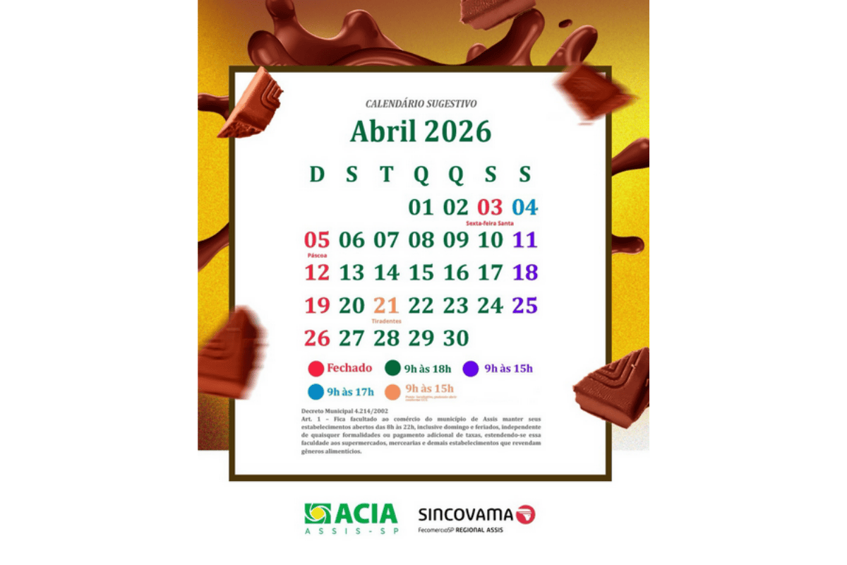 O comércio de Assis terá horários diferenciados ao longo de abril de 2026, principalmente por conta da Páscoa e do feriado de Tiradentes. O calendário sugestivo divulgado pela ACIA orienta lojistas e consumidores sobre o funcionamento durante o mês.