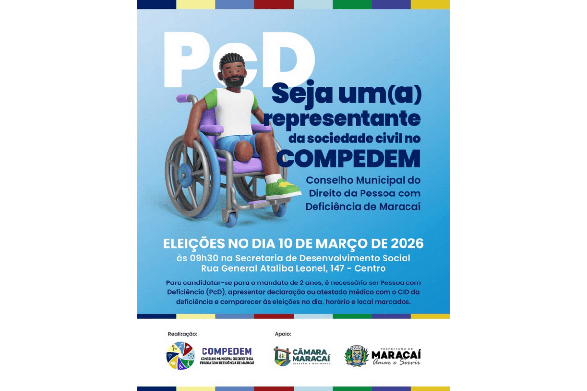 O município de Maracaí realizará, no dia 10 de março de 2026, a eleição para representantes da sociedade civil no Conselho Municipal do Direito da Pessoa com Deficiência (COMPEDEM). O processo é voltado a pessoas com deficiência que desejam participar ativamente da formulação, acompanhamento e fortalecimento das políticas públicas voltadas à inclusão e aos direitos das pessoas com deficiência no município.