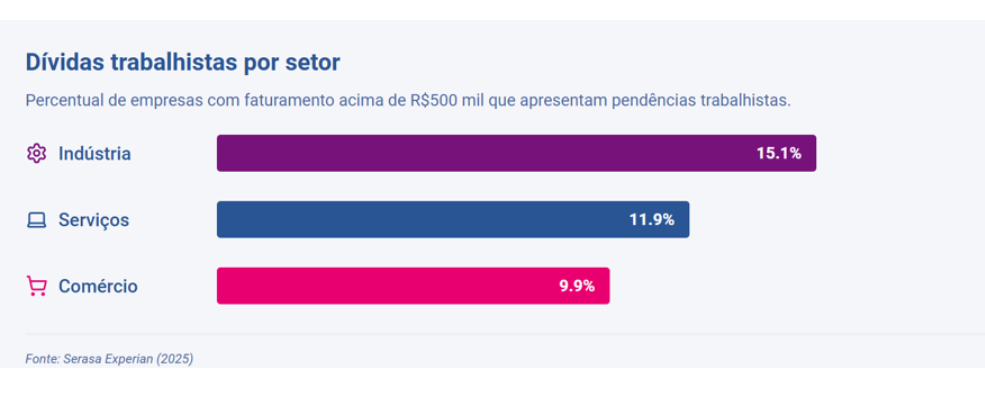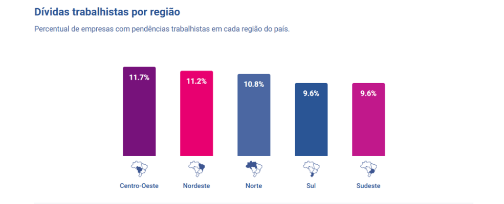 Setorialmente, o levantamento aponta que a indústria lidera com 15,1% das empresas apresentando dívidas trabalhistas, seguida pelo setor de serviços com 11,9% e comércio com 9,9%. Entre as regiões, o Centro-Oeste registra o maior índice, com 11,7%, seguido por Nordeste (11,2%), Norte (10,8%) e, empatadas, Sul e Sudeste com 9,6%.