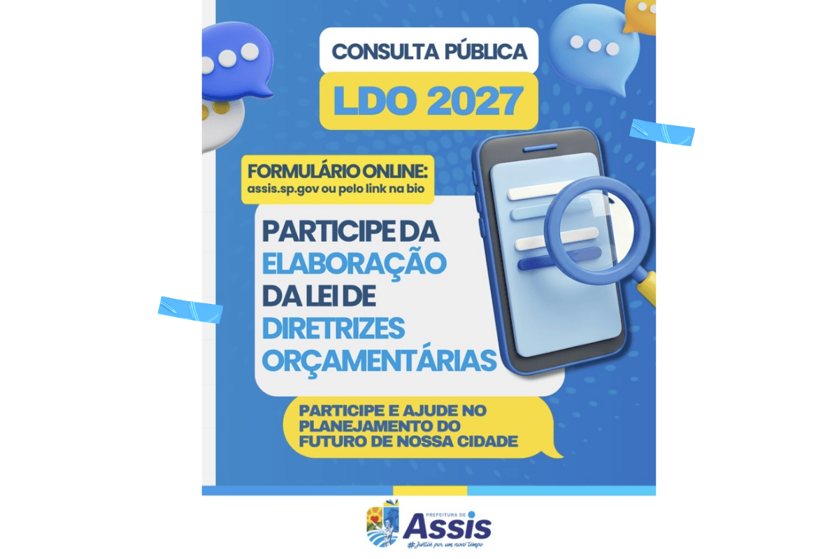 A Prefeitura de Assis abriu a consulta pública para a elaboração da Lei de Diretrizes Orçamentárias (LDO) de 2027. A população já pode participar do processo e indicar quais áreas devem ser prioridade no próximo ano, contribuindo diretamente para o planejamento e a destinação dos recursos públicos do município.