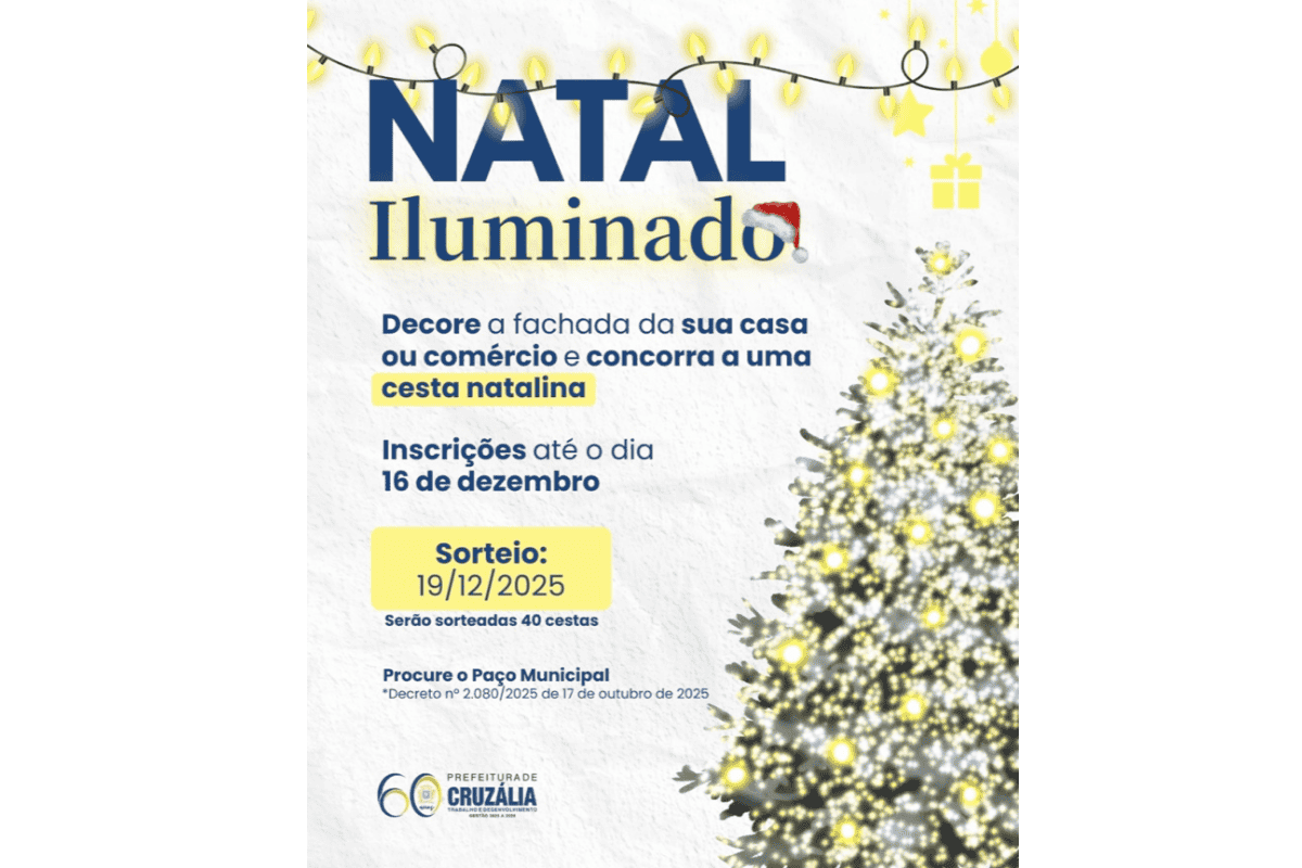 A Prefeitura de Cruzália iniciou as inscrições para o Natal Iluminado 2025, que segue até 16 de dezembro e contempla moradores e estabelecimentos comerciais da cidade. A iniciativa busca estimular a decoração de fachadas para celebrar o período natalino e premiar participantes com o sorteio de 40 cestas natalinas, marcado para 19 de dezembro, no Paço Municipal.