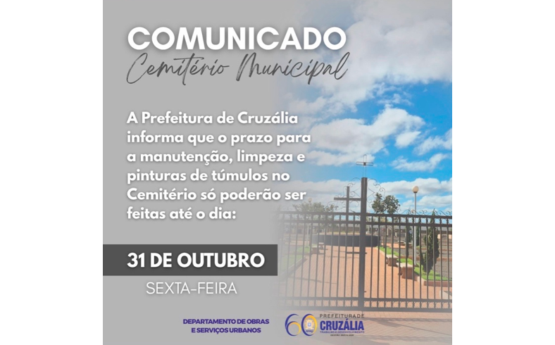 A Prefeitura de Cruzália, por meio do Departamento de Obras e Serviços Urbanos, informa que o prazo para manutenção, limpeza e pintura de túmulos no Cemitério Municipal segue aberto até o dia 31 de outubro, sexta-feira.